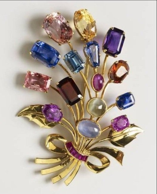 To prove the point, here’s a jewel from The Late Queen’s collection – the Sri Lankan Navaratna Brooch presented by the Mayor of Colombo to The Late Queen on a visit to this Commonwealth nation in 1981. Throughout the last 2,000 years, Sri Lanka has been the richest source of sapphires of many colours. The word navaratna means 'nine gems' in Sanskrit, but (excluding the calibre cut rubies) this actually has 15 single stones all famed for their occurrence in the country and not all of them are sapphires... can you tell which ones are the sapphires (blue, pink & yellow) and which ones are the moonstone, garnet, amethyst, catseye and aquamarine?
